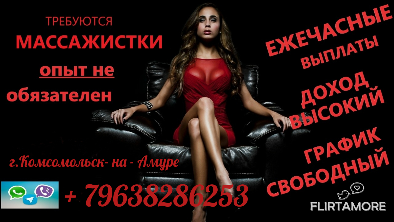 Комсомольск-на-Амуре - Требуется Девушки! мастера ручного массажа, классический, спортивный, расслабляющий (без опыта) . ?? Требования к сотрудникам: -общительные -аккуратные -пунктуальные Мы предоставляем вам: - Бесплатное профессиональное обучение в короткие сроки? - гибкий график работы? - ежедневная оплата 50% от программы ?? Выбирая нас, вы получите: - Бесценный опыт работы - Гибкий график работы? - Дружный коллектив? - Стабильную заработную плату? Прекрасные условия для работы и проживания!